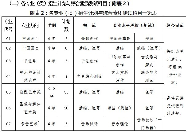 五、综合素质测试时间、各专业(类)招生计划与综合素质测试科目